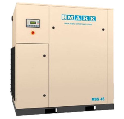 Винтовой компрессор Mark MSS-45A/10 производительностью 5580 л/мин, рабочим давлением в 10 атм и мощностью в 45 кВт. Работает от сети напряжением в 380 В. Тип привода – Ременной.